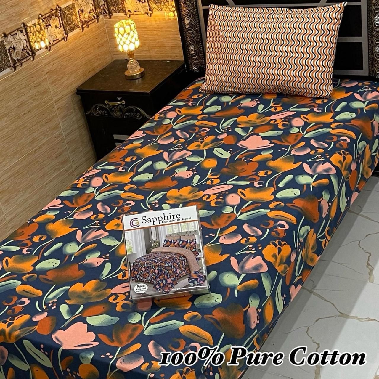 Cotton Single Bedsheet – Navy Floral Design with Orange & Green Flowers In Stock